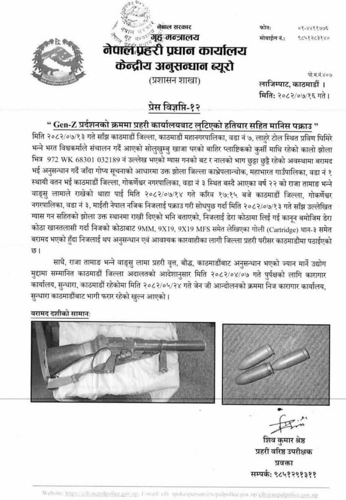 १६ कात्तिक, काठमाडौं । जेन-जी प्रदर्शनका क्रममा प्रहरीको हतियार लुट्ने एकजना पक्राउ परेका छन् । काठमाडौं-७ स्थित लाहुरे टोलमा रहेको एक पसलबाट झोलामा राखिएको अवस्थामा बन्दूकको बट र नाल बरामद गरिएको हो ।